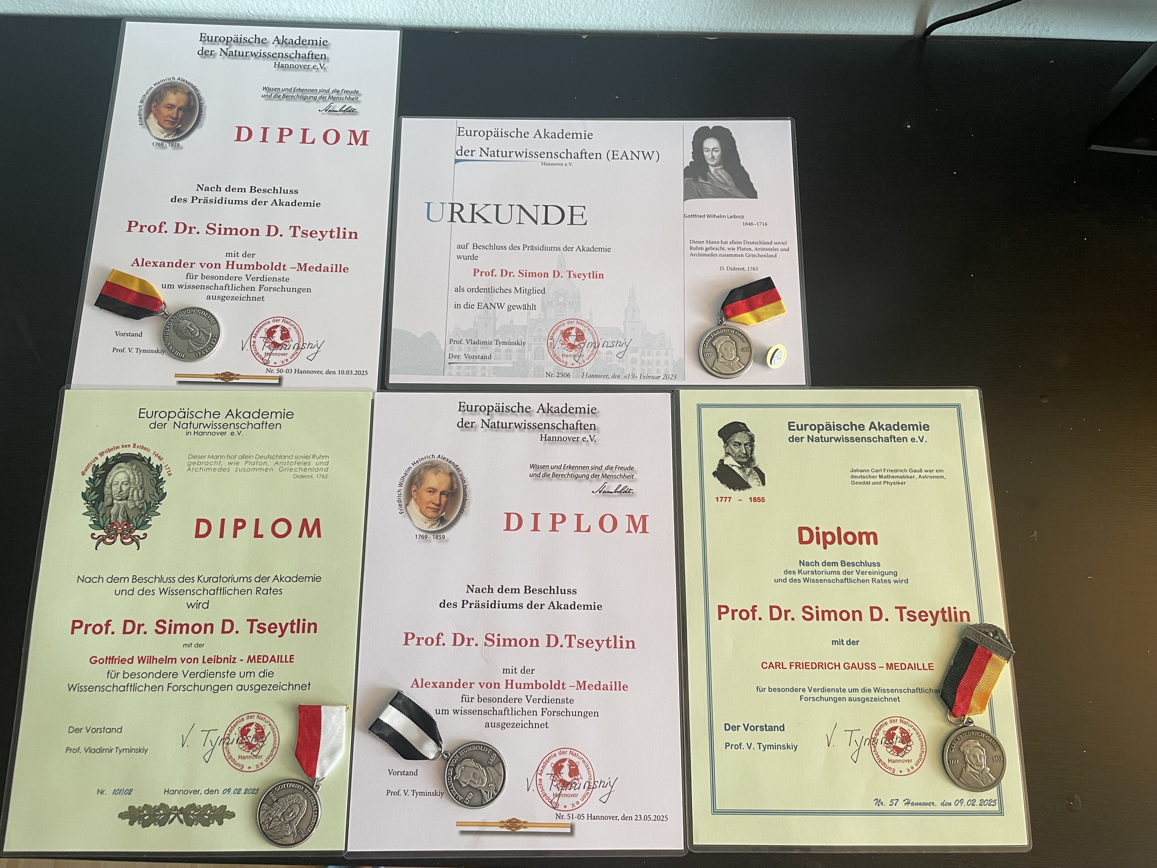 Medals received by Dr. SImon Tseytlin for his achievments in science.